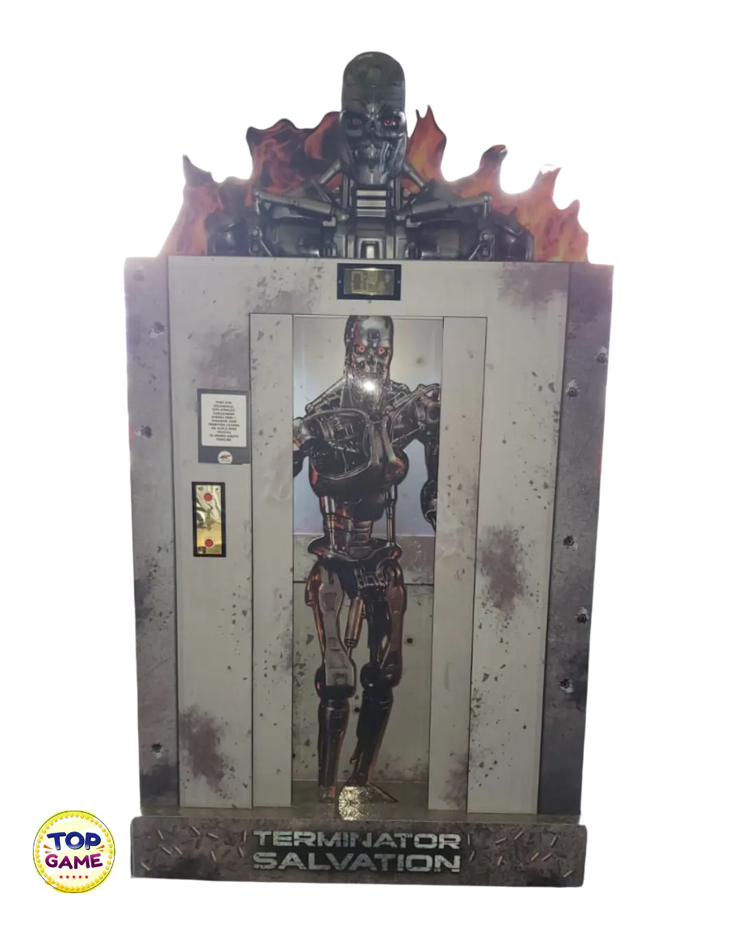 A estrutura fechada, com iluminação interna e detalhes em 3D, como o T-800 em chamas no topo, transporta os jogadores diretamente para o campo de batalha contra as máquinas.