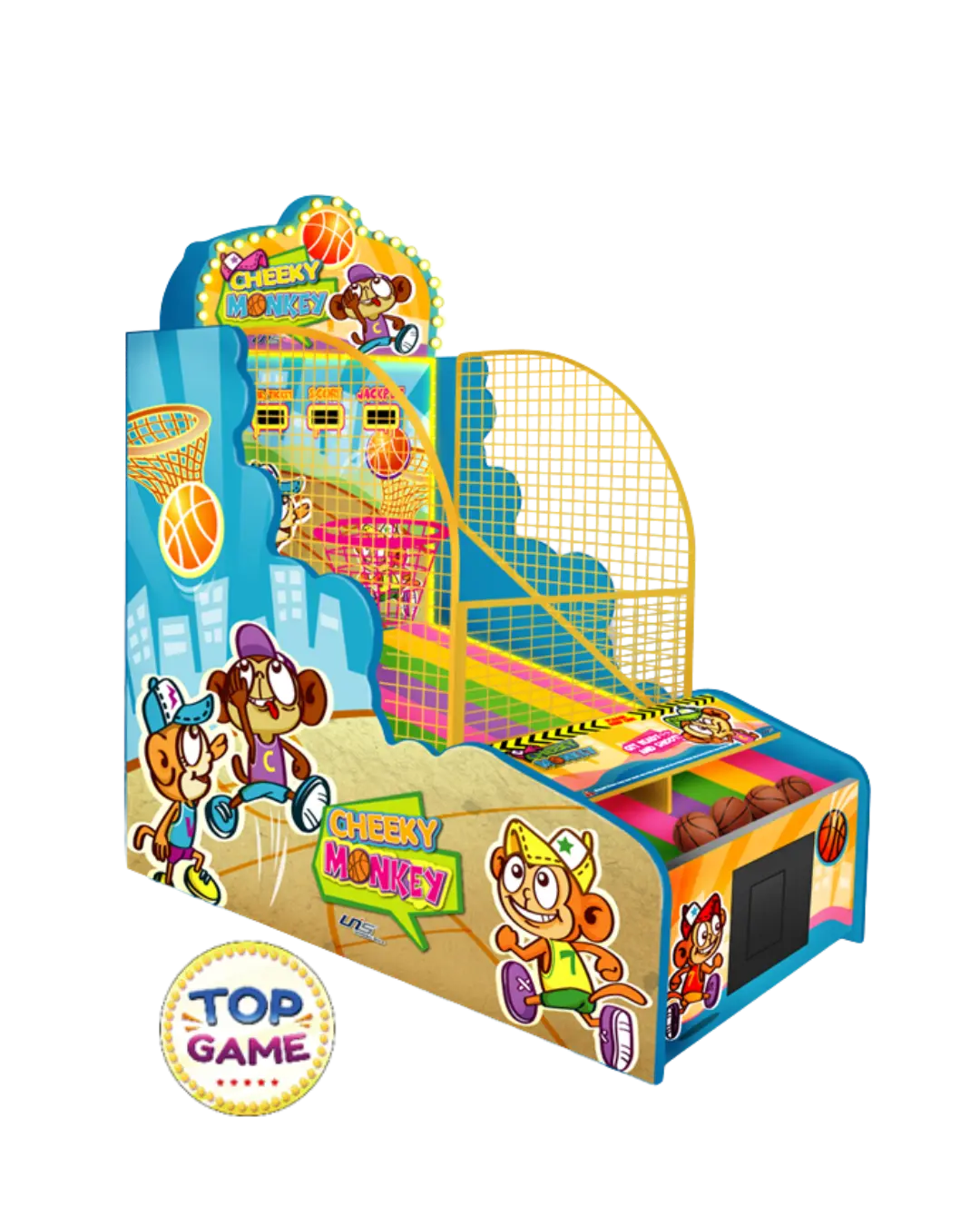 Cheeky Monkey é uma versão infantil e super divertida do clássico jogo de basquete! Com design colorido, personagens carismáticos e gameplay intuitivo, essa máquina é um verdadeiro sucesso entre as crianças nos buffets e áreas kids.