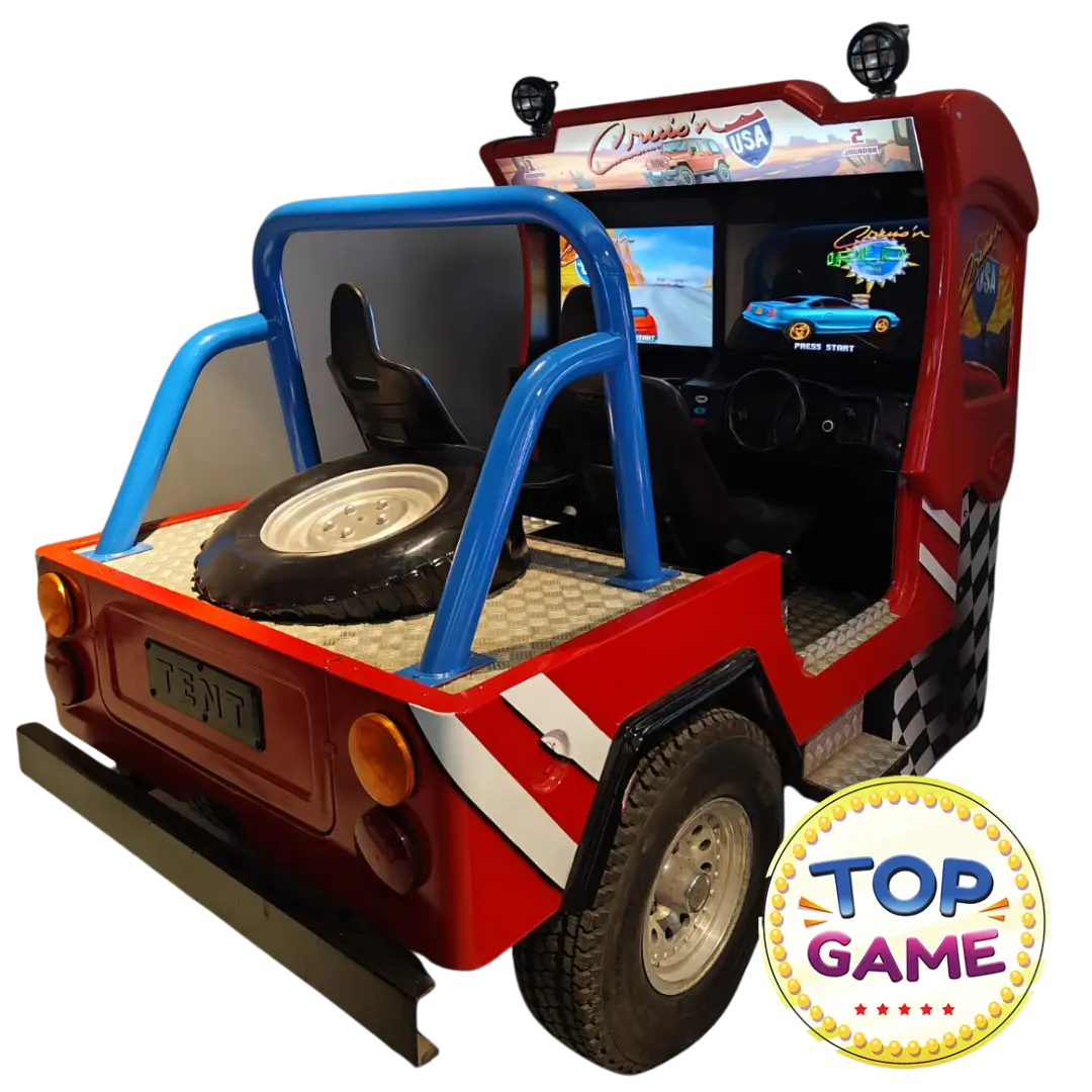 Esse simulador em forma de Jipe estilizado é um verdadeiro convite à diversão! Com um visual imponente e nostálgico, ele recria toda a emoção das corridas clássicas do jogo Cruis’n USA com um toque especial: a carroceria reproduz um jeep real, com volante, pedais, pneus e bancos integrados, garantindo imersão total!