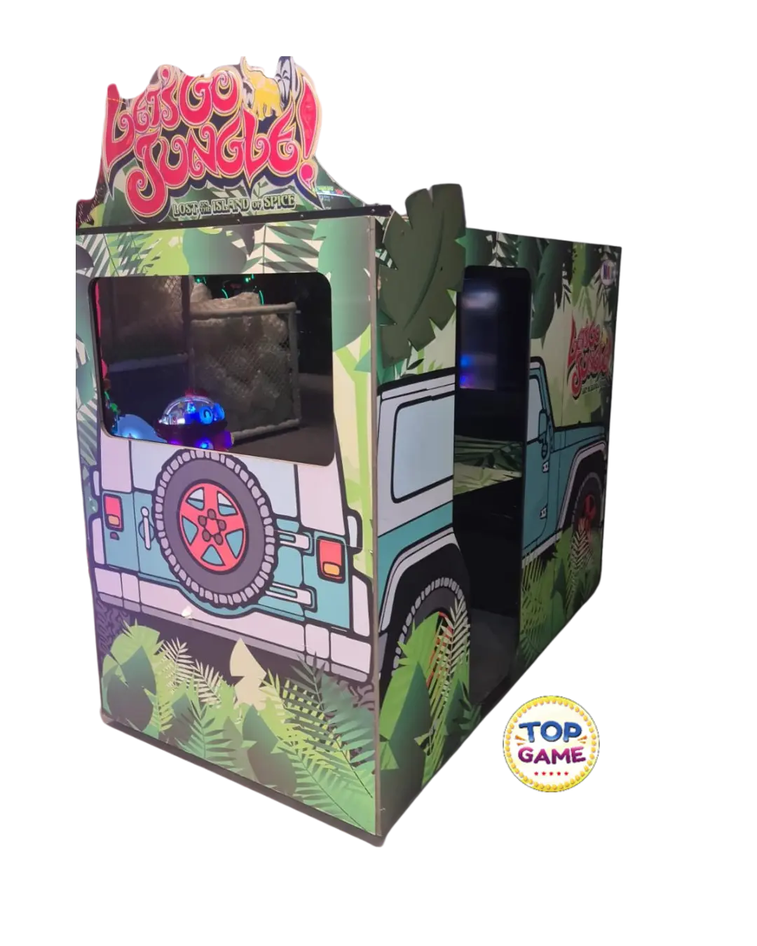 Let’s Go Jungle! – Lost on the Island of Spice é uma experiência cooperativa de tiro sobre trilhos (rail shooter) cheia de ação, monstros gigantes, paisagens tropicais e… MUITO humor! Produzido pela SEGA, essa máquina é uma cabine imersiva que simula um passeio de jipe por uma ilha selvagem — mas que rapidamente se transforma em uma corrida pela sobrevivência!