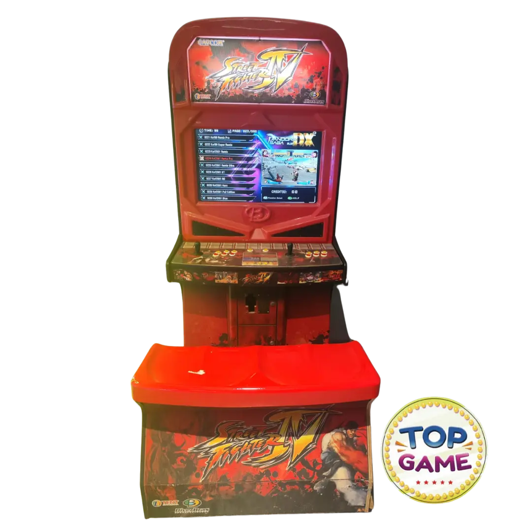 Essa é a máquina de arcade com o tema Street Fighter IV, da Capcom, um dos maiores sucessos dos jogos de luta! 🥋🔥