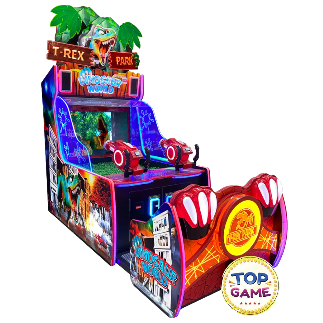 Jogo de pistola de luz com tema de dinossauro para 2 jogadores com bilhetes de resgate. Um gabinete menor e mais compacto do que o jogo de pistola de água T-Rex Park maior. Este jogo se encaixa em lugares onde os jogos maiores de pistola de água e tiro de bola podem não caber.